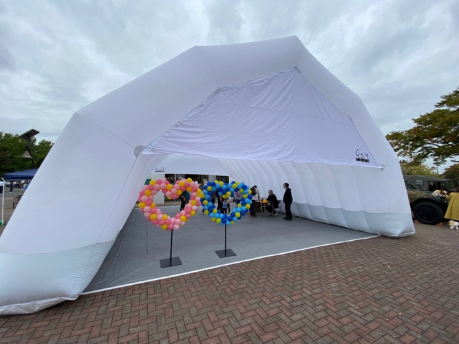 空気を入れて短時間で設営できる「エアーテント」を設置。 災害時には避難所や救護スペースとして使えます。大切な暮らしを守るための備えとして活躍!