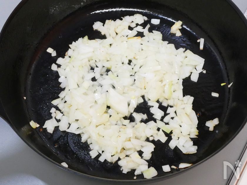 同じフライパンに、オリーブオイル・にんにくを入れ、弱火(IHヒーター火力ランプ[2])で熱し、にんにくの香りがしてきたら玉ねぎを加え、中火(IHヒーター火力ランプ[5])でしんなりとするまで炒める。