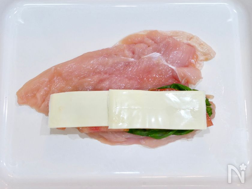 (1) キッチンペーパーで鶏むね肉の水分を拭き取り、トマト・バジルの葉・スライスチーズを挟む。