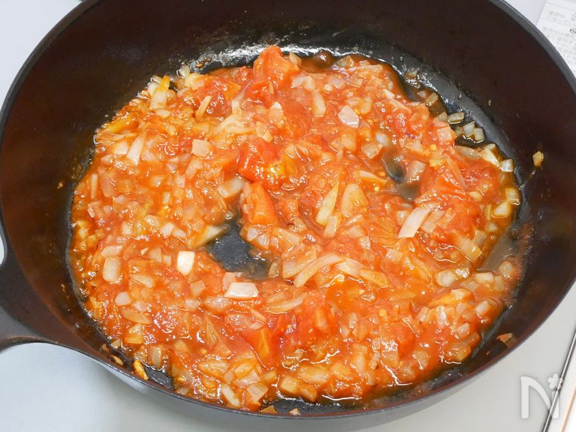 (5) 【A】を加え、中火(IHヒーター火力ランプ[4])で水分が少なくなるまで3~4分煮詰める。
