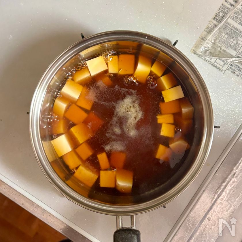 (4) 鍋に②のだしカップ1と1/4、【C】を入れて中火にかける。