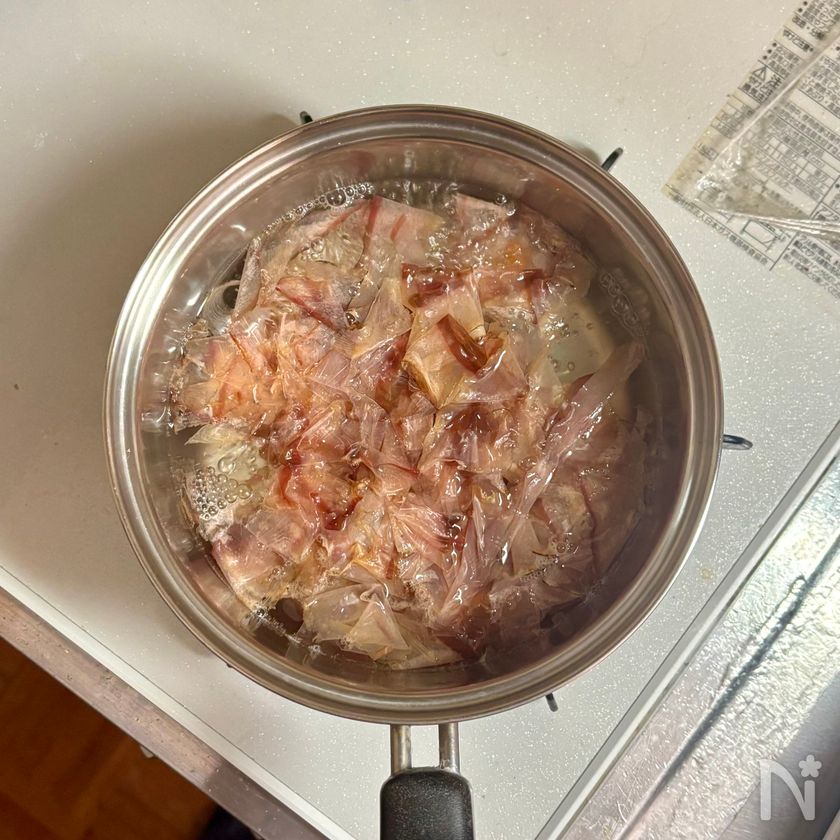 煮立ったらかつお削りぶしを加えて菜箸で沈め、2分ほど煮出す。