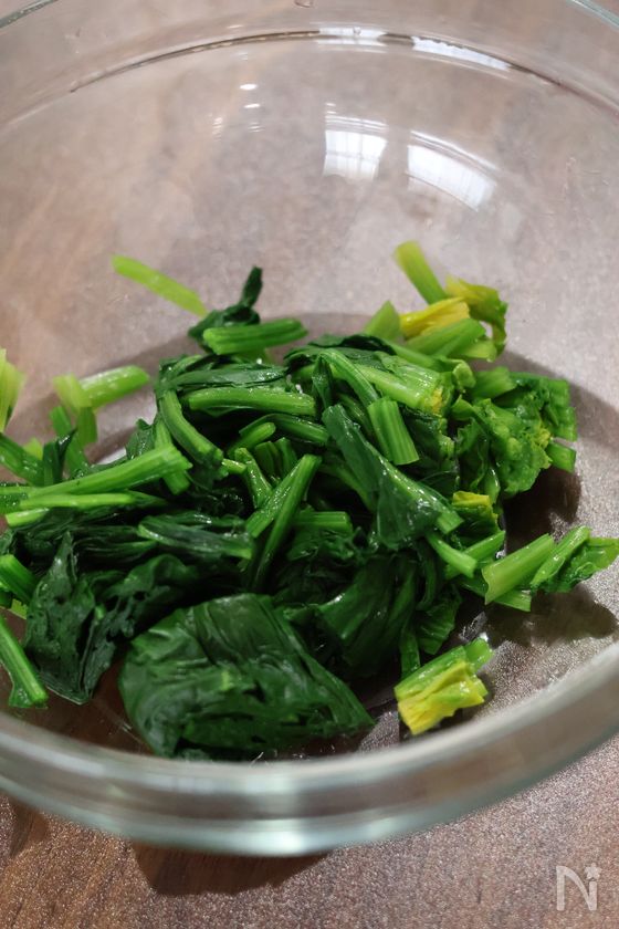 (1) ほうれん草の色が鮮やかになるまで茹でる。(熱湯で1分程度)