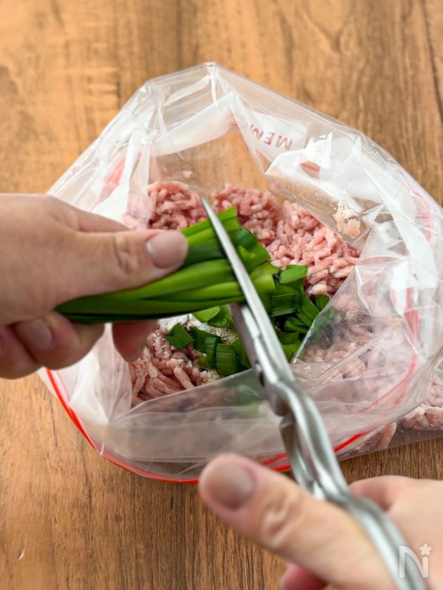(1) 保存用袋に豚ひき肉と【A】を入れ、ニラをキッチンバサミで1cm幅に切りながら加える。袋の上からよくこねる。