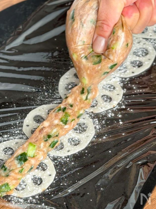 ラップの上にれんこんを並べ、片栗粉を振る。1の袋の角を切り落とし、れんこんの上に肉だねを棒状に絞り出す。