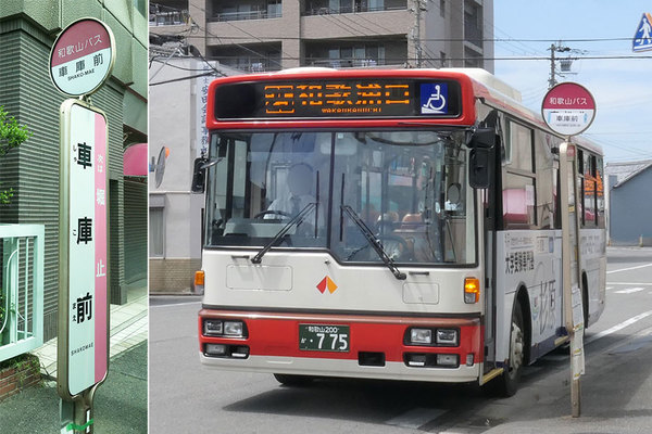 車庫前バス停と和歌山バス(宮武和多哉撮影)。