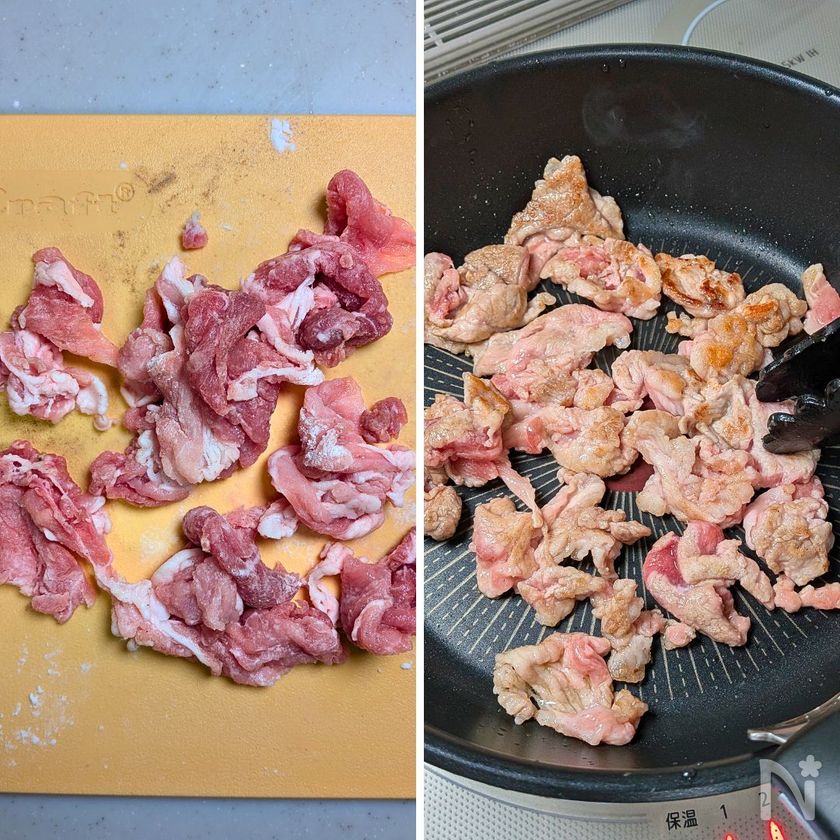 熱したフライパンにごま油をひき、豚こま切れ肉を中火で炒める。