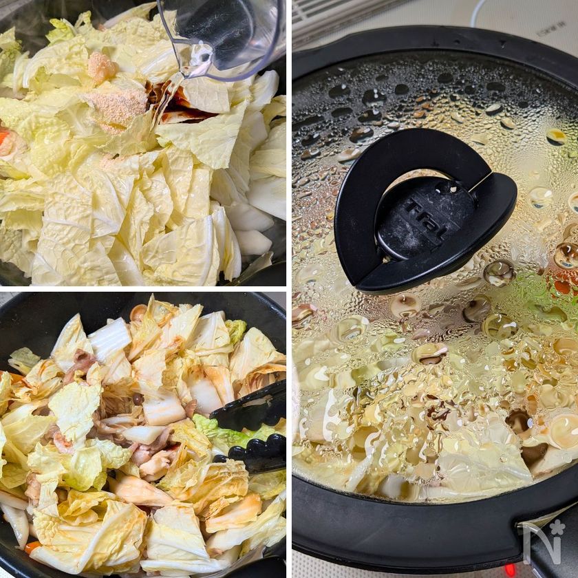 (4) 白菜の葉と【A】を加えて全体を混ぜ、蓋をして弱めの中火~中火で5分煮る。