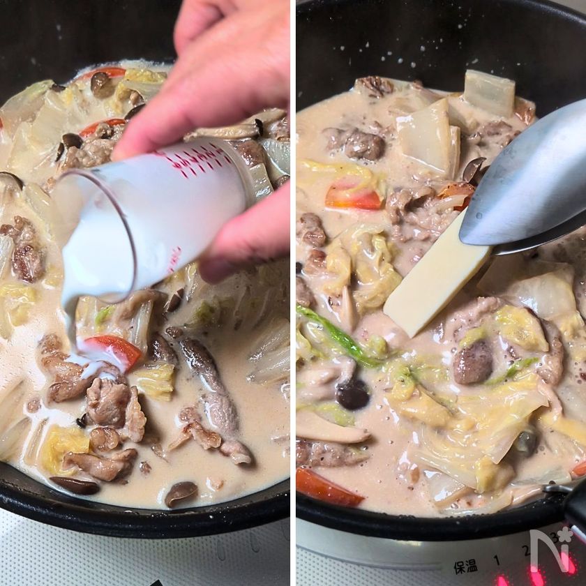 再び弱火で加熱し、とろみが付いたらバターを加えて火を止めて塩・こしょう(仕上げ用)で味をととのえる。