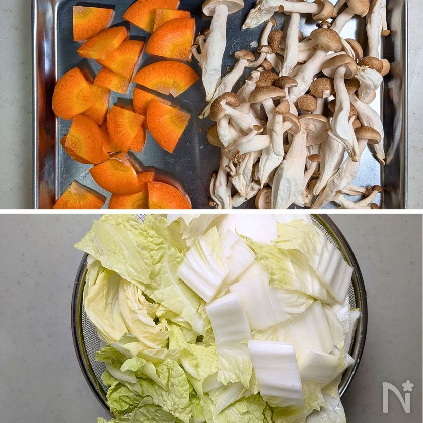 (1) 白菜は繊維を断つようにざく切りにする。芯の部分と葉の部分を分けておく。