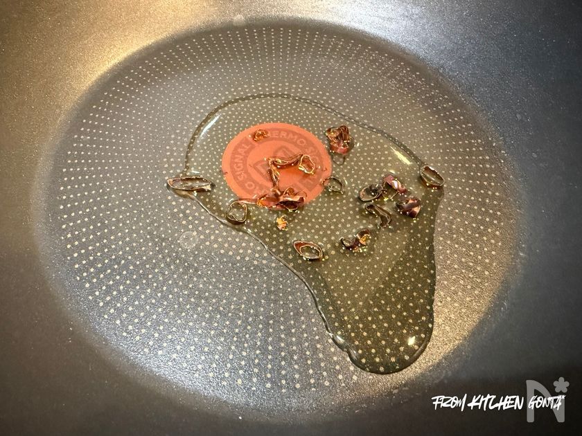 (1) フライパンにごま油と輪切り唐辛子を入れ、香りをたたせる。