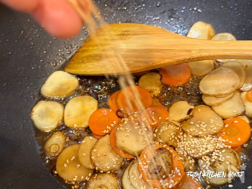 (5) 仕上げに、炒りごまを加えて、よく混ぜる。