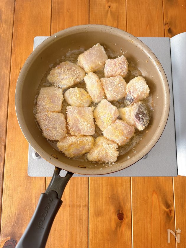 衣がはがれないよう、揚げ焼きするとき触らず我慢するのがポイント!