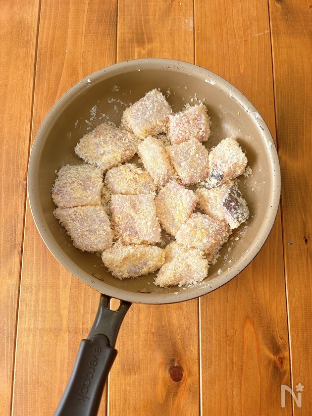 (1) 塩胡椒をまぶし、マヨネーズをまぶし、パン粉をまぶす。