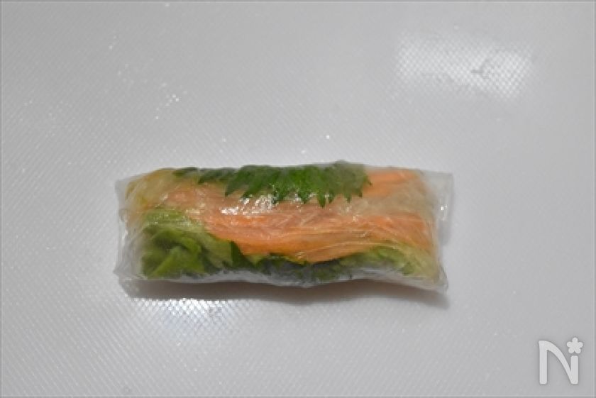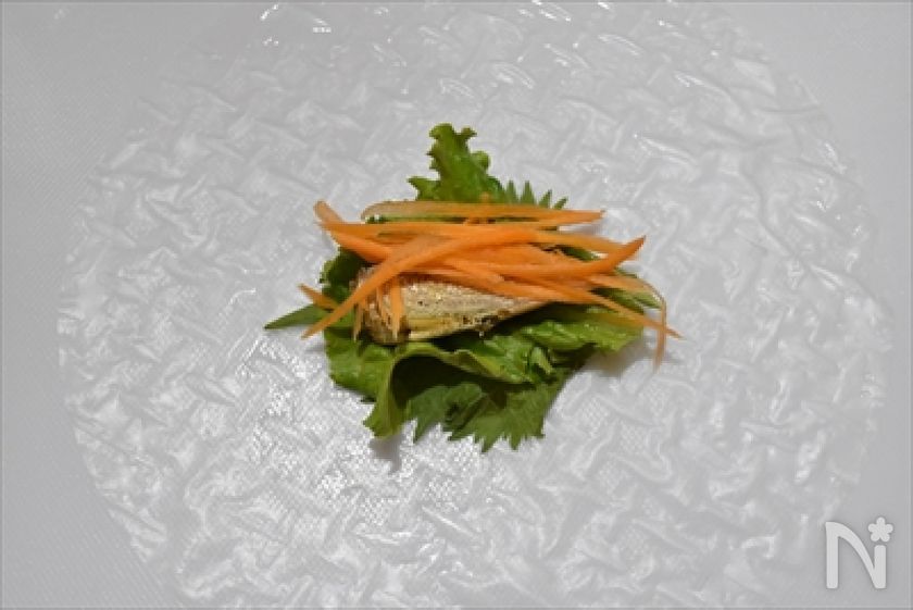 (2) 1の上に、大葉、ちぎったレタス、オイルサーディン、千切り人参をのせ手前から、きっちりと包む。