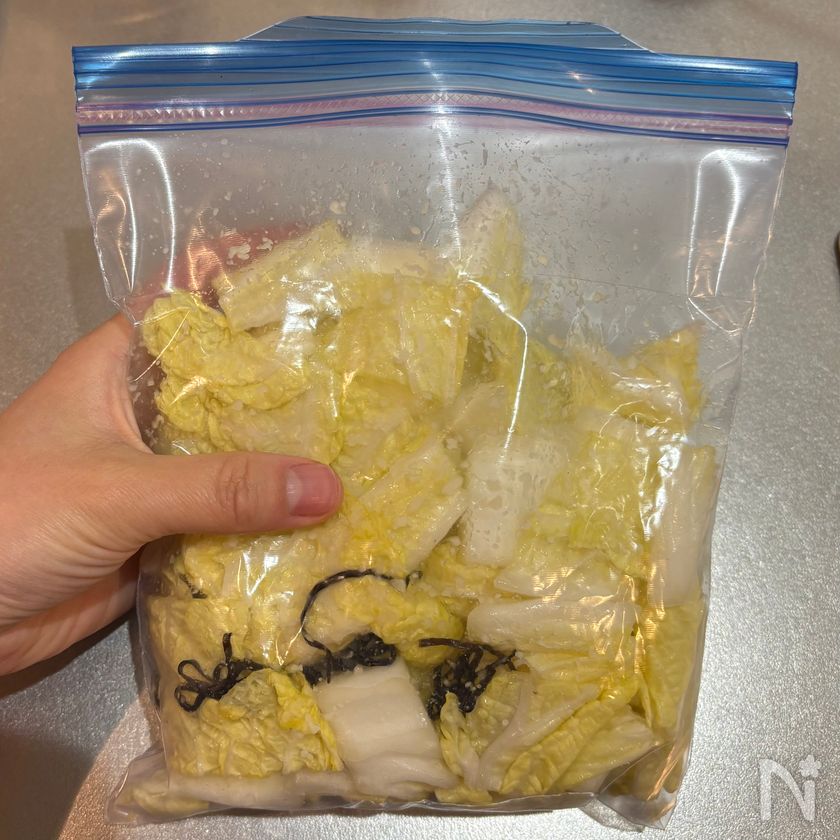 (2) 厚手のチャック付きポリ袋に入れたら塩麹と塩昆布を入れて揉みこみ、冷蔵庫で30分以上おく。