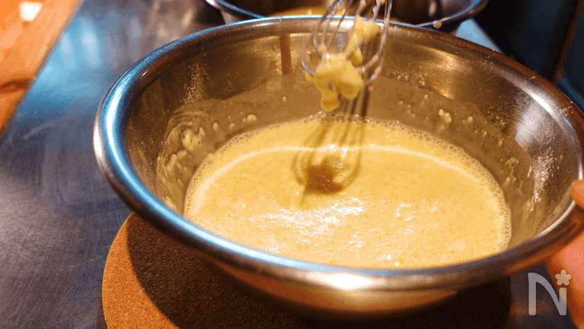 薄力粉に8の卵水を加えホイッパーでやさしく混ぜる。(薄力粉と卵水は同量が目安。すこしダマが残るぐらいに混ぜる)