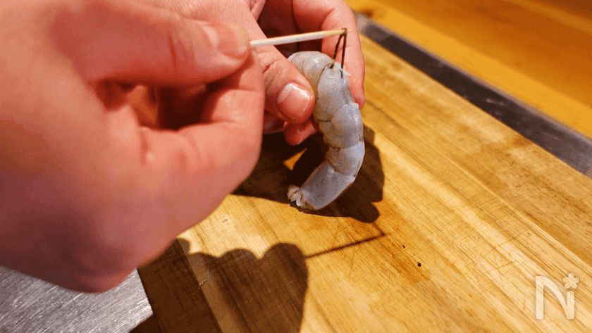 (7) 海老は殻を剥き背側に爪楊枝を刺し、背ワタを引き抜く。尾先の部分には水分があり、油はねの原因になるので斜めに切り、包丁でしごき水分を抜く。