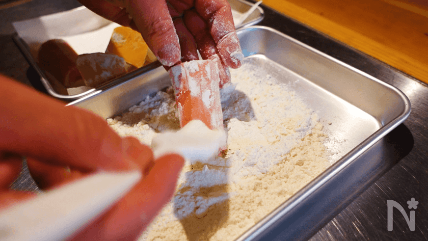 (10) 野菜と海老にハケを使い薄く薄力粉(分量外)をまぶし、天ぷら衣にくぐらせる。