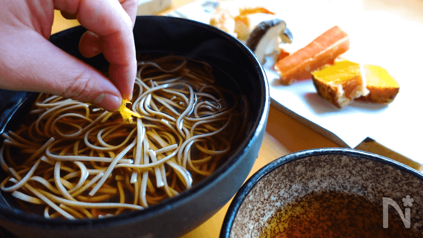 (13) 蕎麦を器に盛り、温めたそばつゆをかけ柚子皮をのせる。