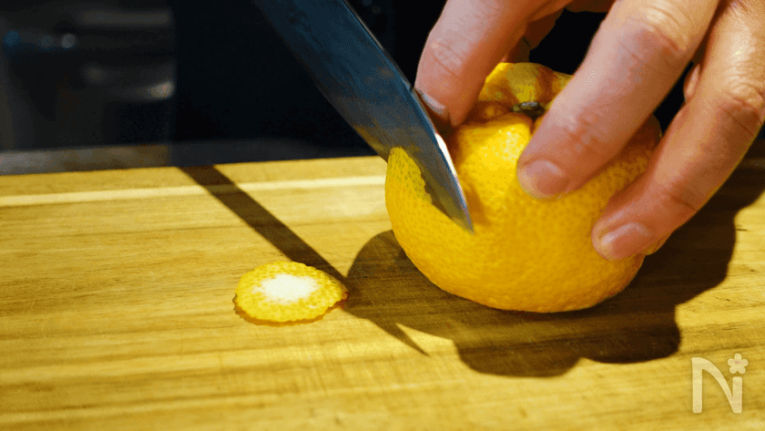 (6) 柚子の内側(白い部分)は苦みになるので切り取り、千切りにする。
