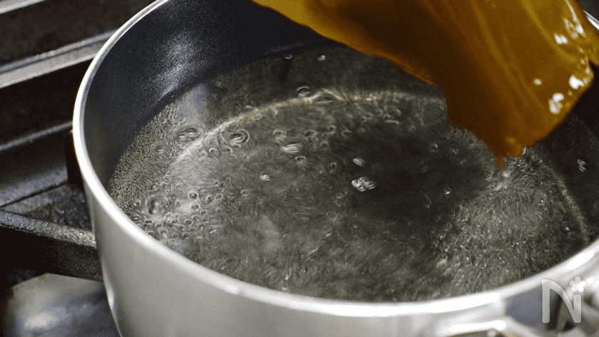 (1) 鍋に【A】を入れ、1時間おく。火にかけ、沸騰直前で昆布を取り出し、火をとめる。