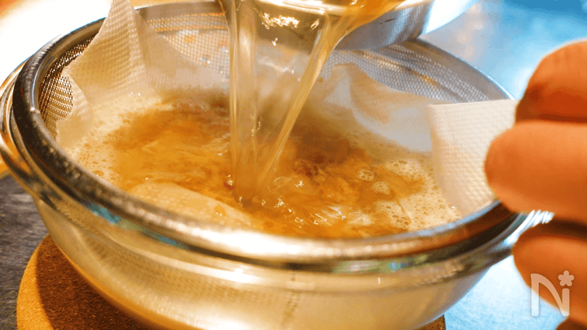 (2) かつお節を加えて1分立ったら、キッチンペーパーを敷いたざるで漉して出汁をとる。