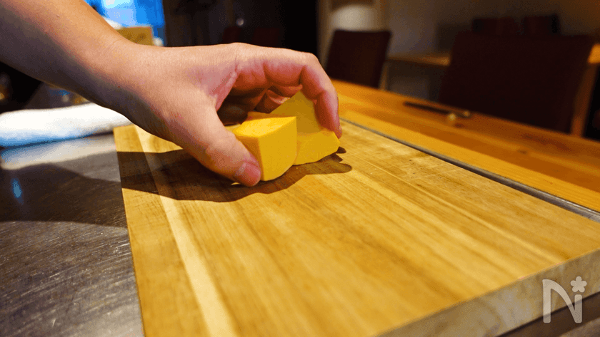 (5) カボチャ、人参は大きめの一口大に切り、椎茸は石づきを切る。