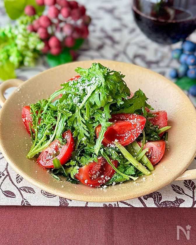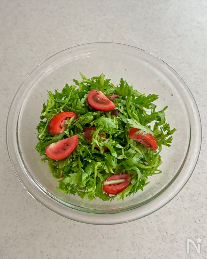 シンプルでおいしい♩春菊とトマトのチーズサラダ