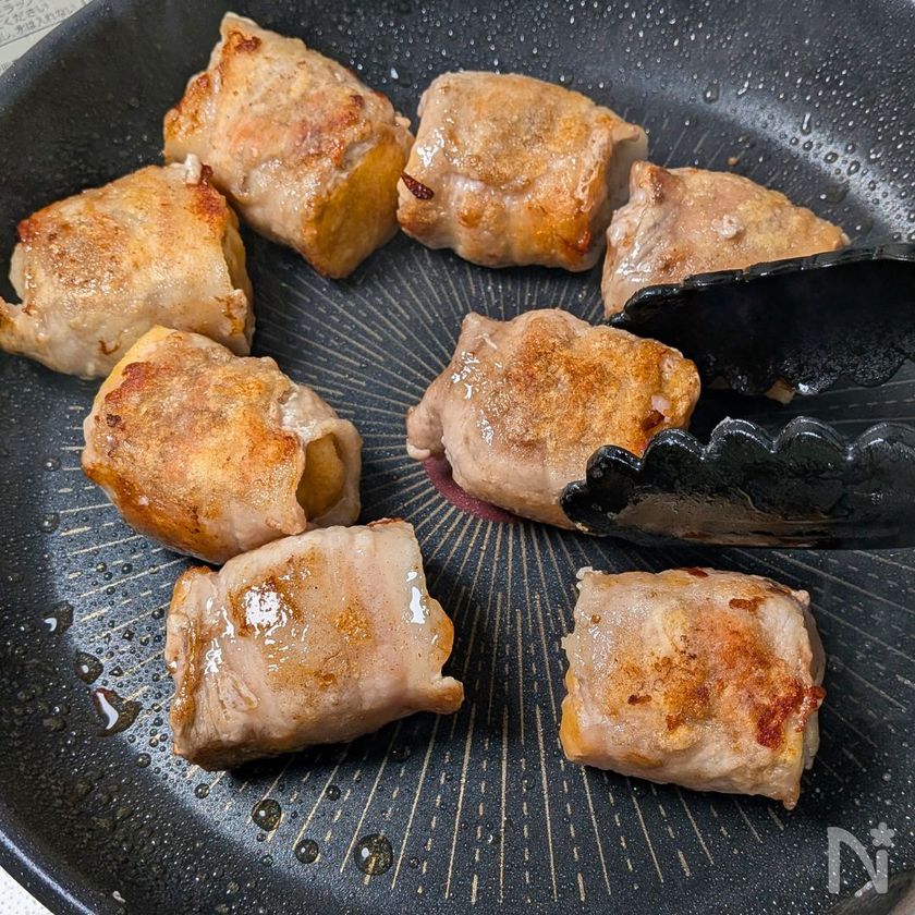 ・肉の巻きを割を下にして焼きましょう。肉がはがれにくくなります。