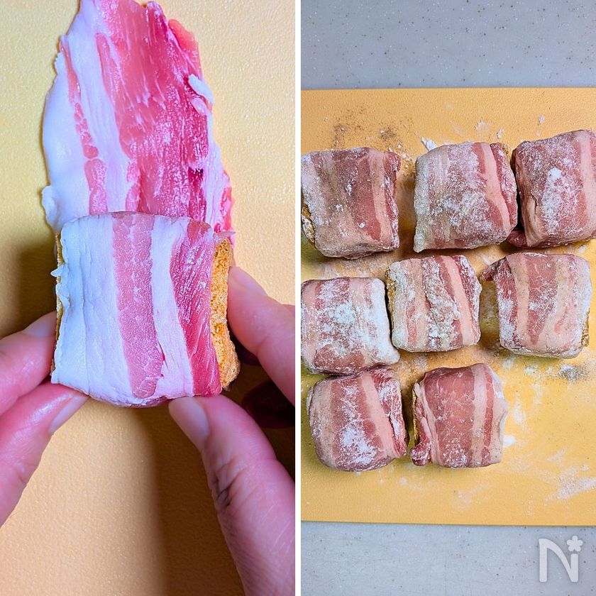 (2) 絹厚揚げに豚ばら薄切り肉を1枚ずつ巻く。