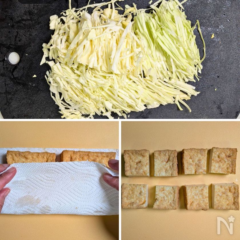 (5) 器に④のキャベツを敷き、③の肉巻き厚揚げを並べる。
