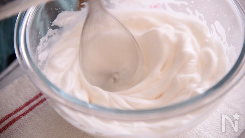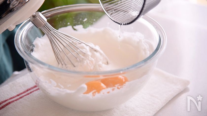 メレンゲは油分や水分などがついていない綺麗なボウルに卵白を入れます。少しでも卵黄が入ってしまうとメレンゲが立たないので注意します。もし卵黄が入ってしまった場合は全卵にグラニュー糖を入れ、ボウルごと湯煎にかけて温めながら泡立てて下さい。ホロホロと崩れるような食感です。保形成を高めるなら薄力粉やコーンスターチを大さじ1程度入れて焼くと良いでしょう。ココット皿に入れて焼いてもOK。