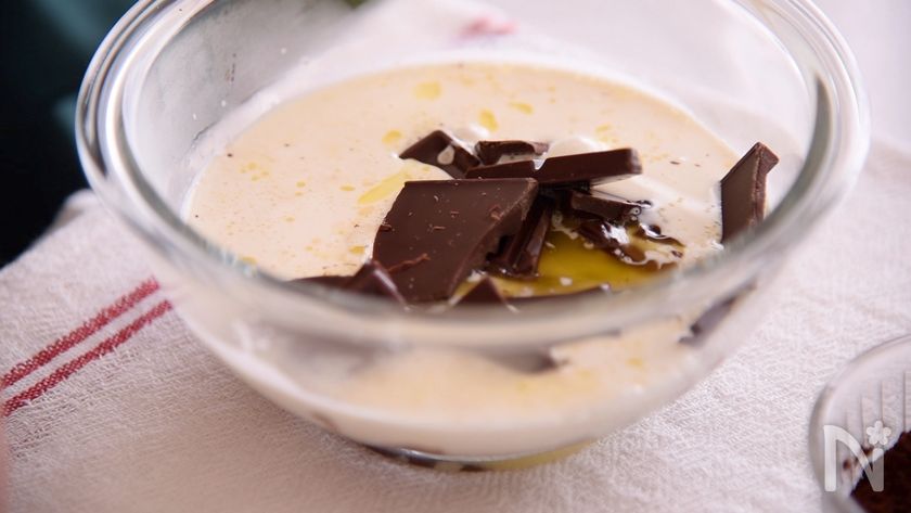 (2) 一旦混ぜて割ったブラックチョコレートを入れてさらに600wのレンジに1分かける。