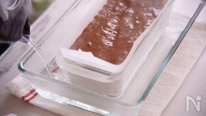 (11) ひとまわり大きい耐熱容器に熱湯を入れて湯煎焼きにします。170度に予熱しておいたオーブンで25分焼きます。