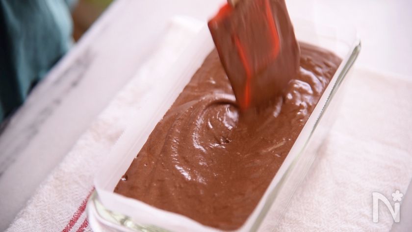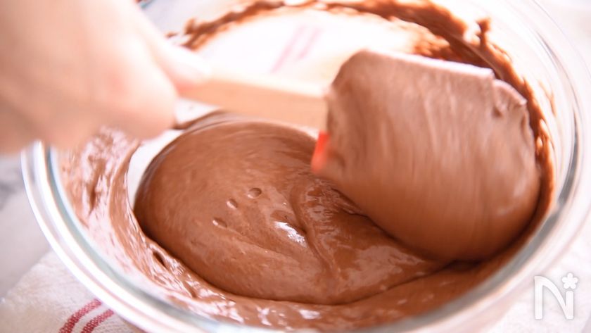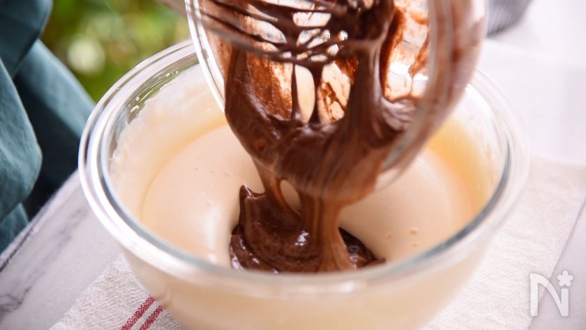 (8) バターチョコの生地に卵生地を2~3回に分けて入れて混ぜます。最後はゴムベラで底からこそげるように綺麗に混ぜます。
