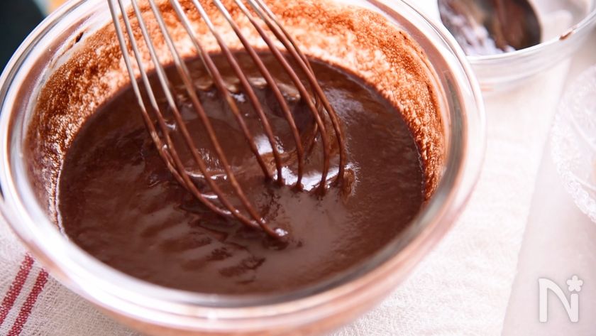 (3) 純ココアパウダーを入れて混ぜる。湯煎にかけてもいい。