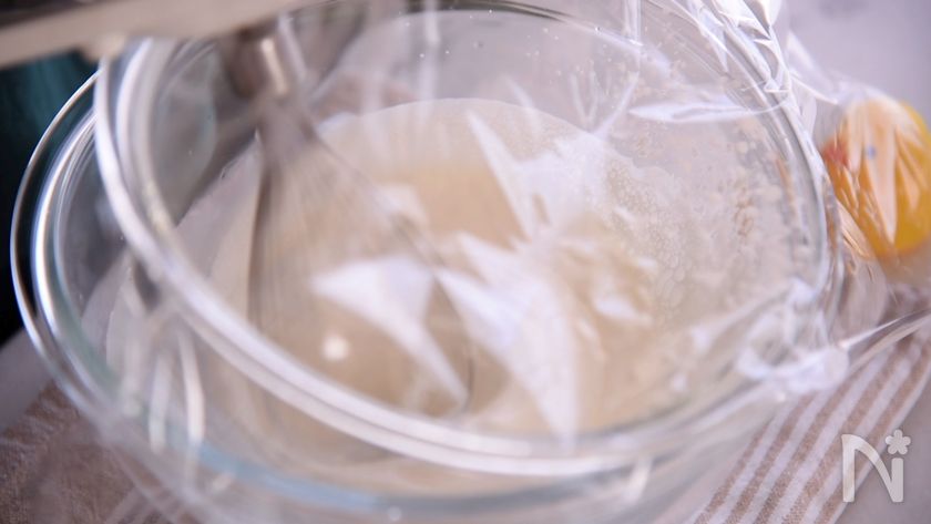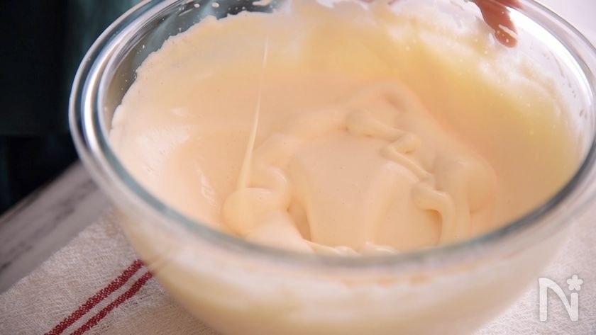 (6) マヨネーズのような色になるまでしっかりとハンドミキサーの高速で泡立てます。文字が書けるくらいになれば、ハンドミキサーを低速に切り替え、さらにキメを整えるために