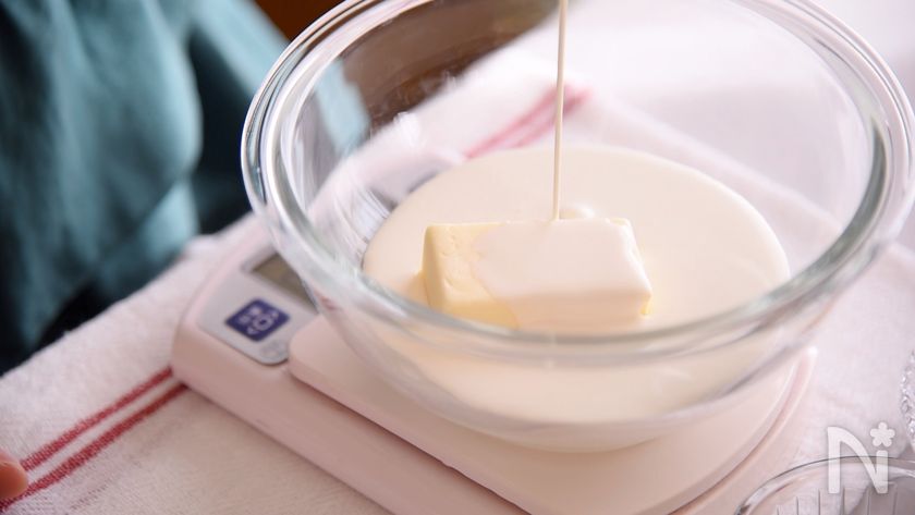 (1) 耐熱ボウルに無塩バターに生クリームを入れて600wのレンジに1分30秒にかける。お好みでブランデーを入れる。