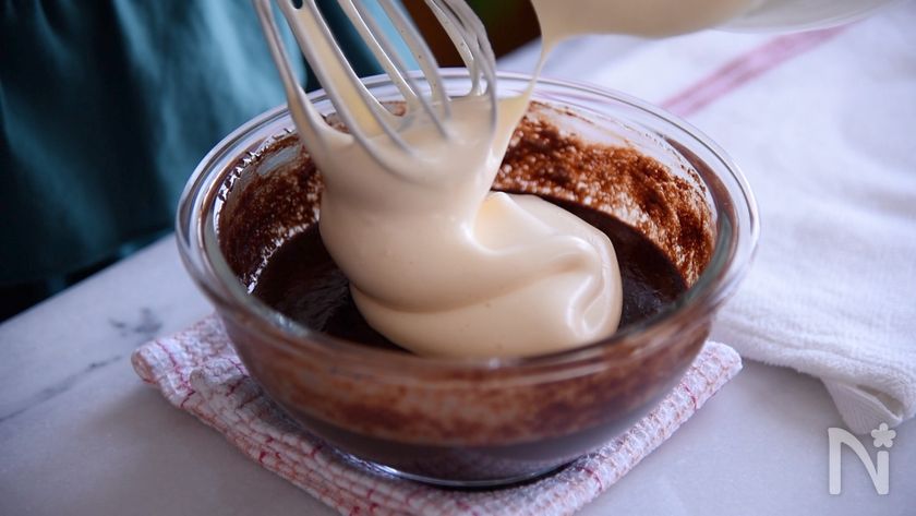 (7) 先に湯煎しておいたバターチョコの生地に泡立てた卵をひとすくい入れて泡立て器でよく混ぜます。よく馴染むまでしっかり混ぜます。