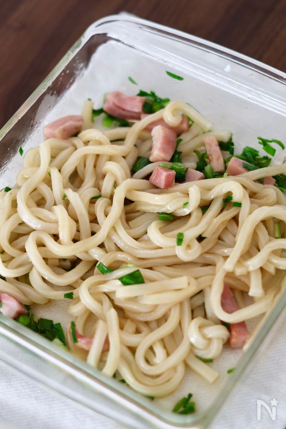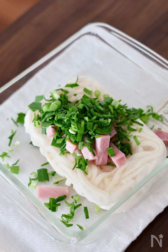 (3) 耐熱容器に冷凍うどん、工程1、工程2を入れてふんわりとラップをかけ、冷凍うどんの袋に表記されている時間の通り電子レンジで加熱する。