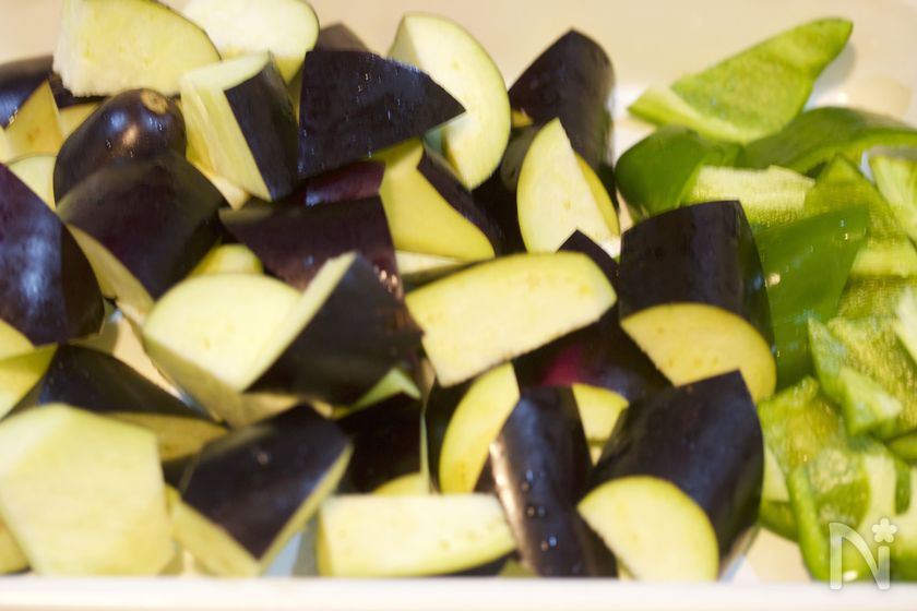 (1) なすはヘタを取って乱切りに、ピーマンはヘタと種を取って乱切りにする。