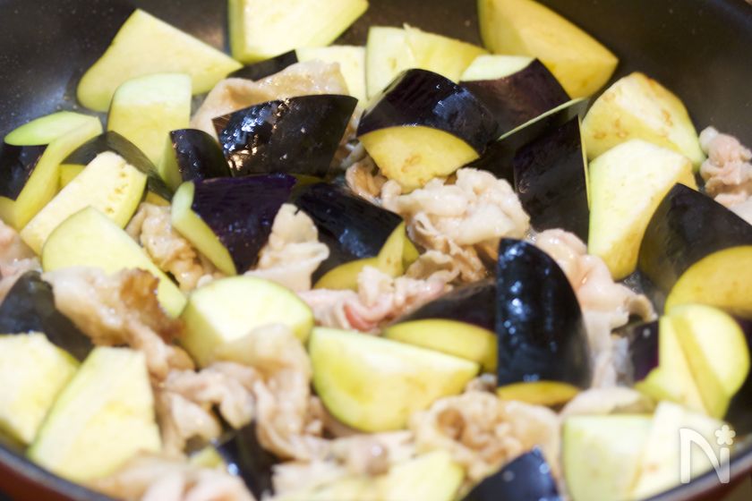 (2) フライパンにごま油を熱し、豚バラ薄切り肉を炒める。豚肉の色が変わったらなすを加えて3分ほど炒める。