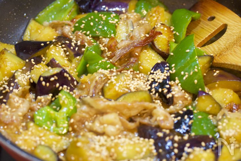 (3) なすに火が通ったら、ピーマンを加えてサッと炒める。合わせた【A】を回し入れ、汁気がなくなるで炒め、いり白ごまをふる。