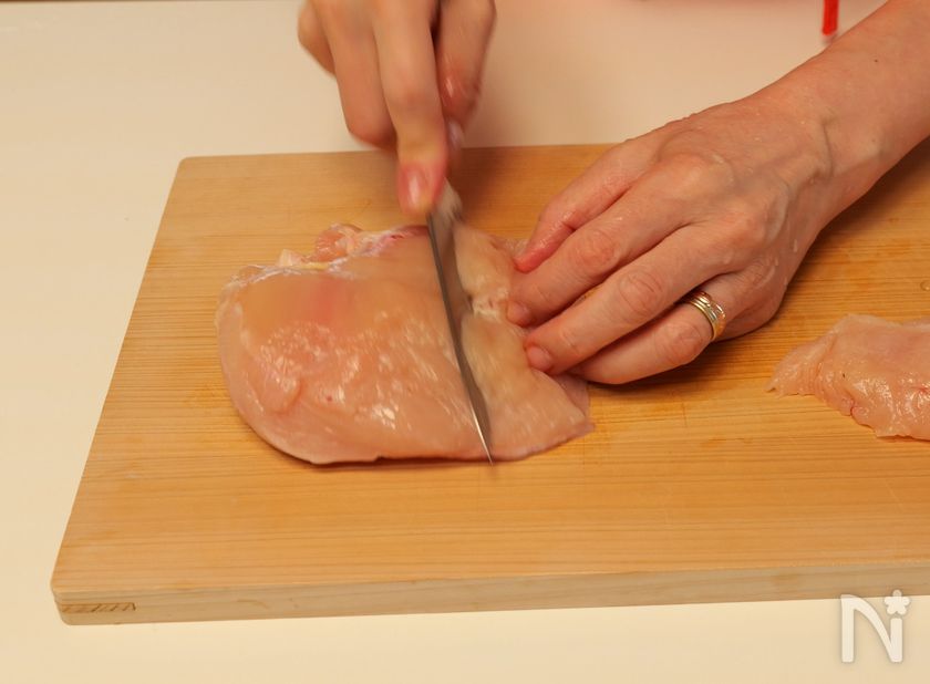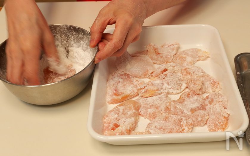 (3) 鶏むね肉に米粉または薄力粉を軽くつける。