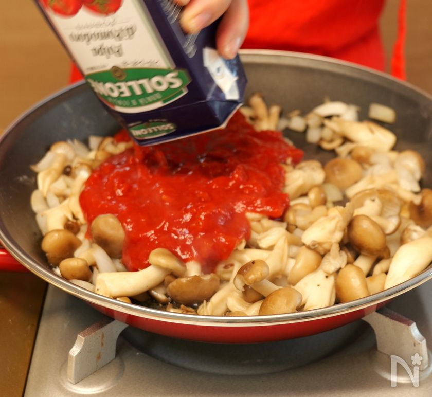 (6) にんにくのいい香りがしてきたらトマトの水煮、水150mlを加える。