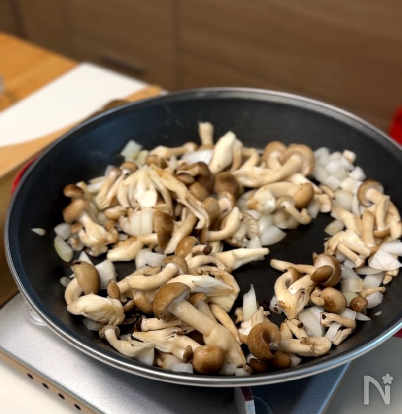 (5) フライパンにたまねぎ・にんにく・しめじを入れて炒める。