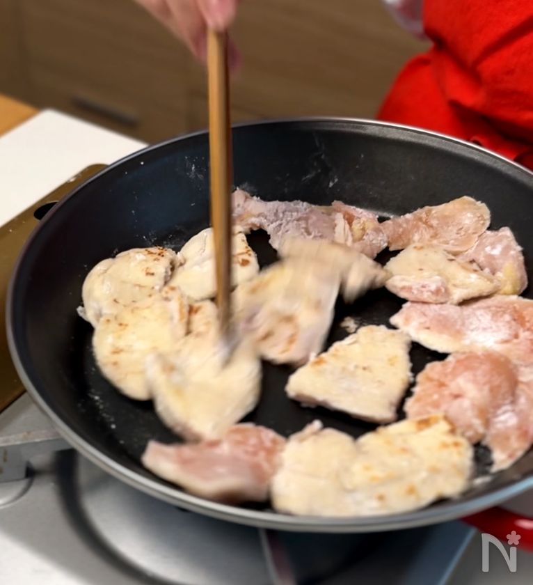 鶏肉をやわらかく仕上げるコツは、そぎ切りにすることと、粉をつけて焼くこと。