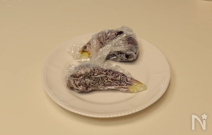 (1) なすは皮の水気を拭き、ラップして500Wのレンジで3~4分ほどやわらかくなるまで加熱し、輪切りにして水に漬け、あく抜きして水気を切っておく。
