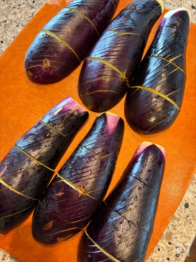 (下準備) 茄子は縦半分に切り、細かく切り込みを入れて3センチ幅に切る。(すぐに使用する場合はあく抜き不要)